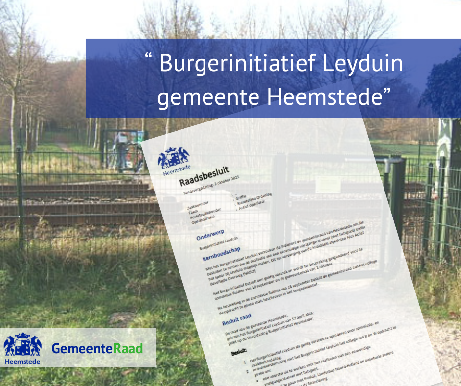 Dit voorjaar gebeurt dit voor het eerst in Heemstede. Op 17 april dient een groep inwoners het Burgerinitiatief Leyduin in. Ze vragen de raad te onderzoeken hoe een voetgangerstunnel met fietsgoot onder het spoor bij Leyduin kan worden gerealiseerd. Zo’n tunnel biedt een veilige toegang tot het landgoed en de omliggende natuurgebieden, nu de onbeveiligde spoorwegovergang daar in 2024 is gesloten.